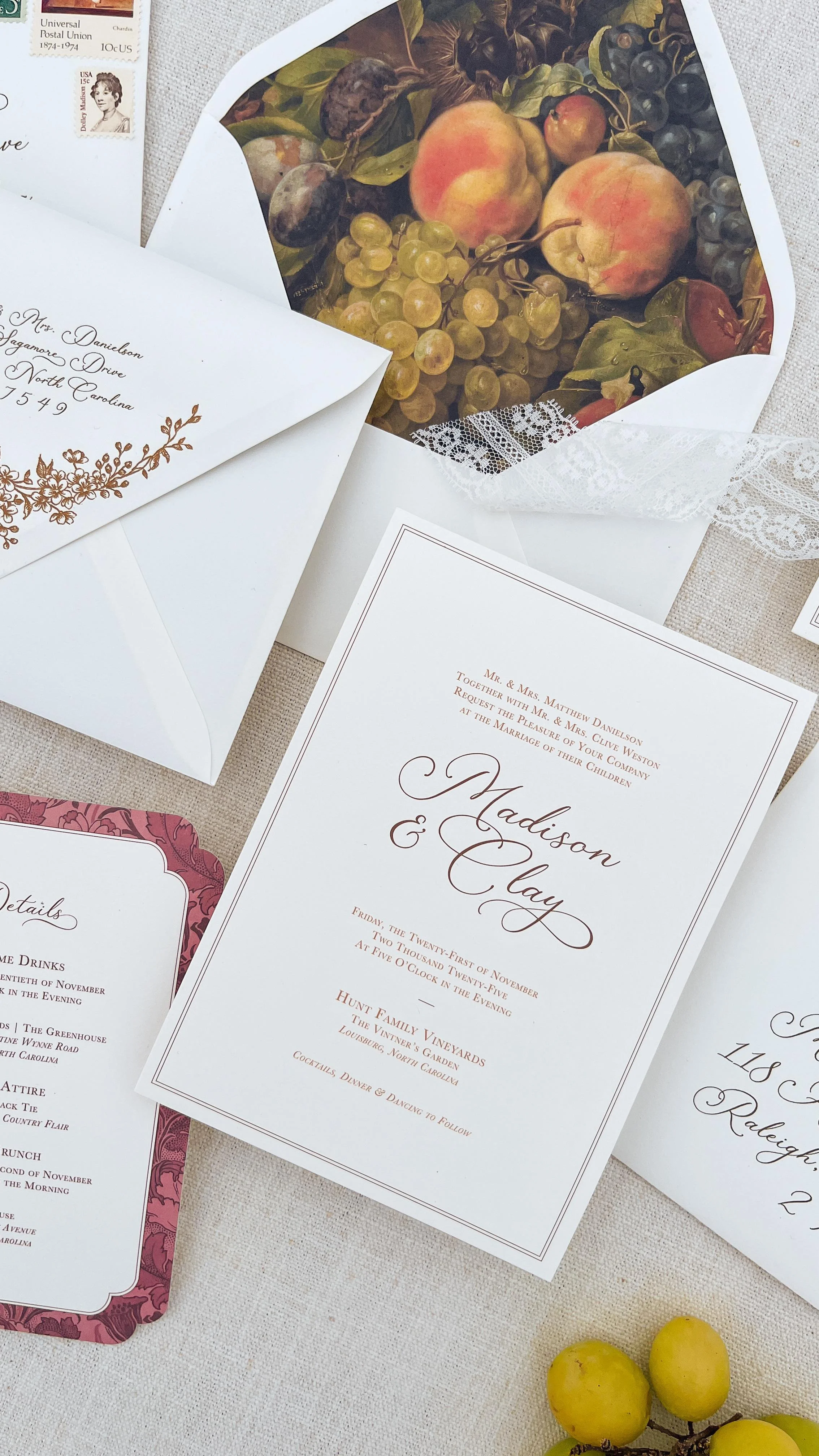 We believe wedding stationery should not only be gorgeous and unique to each couple but also serve you and your guests well. Through thoughtful details and timeless designs, our goal is to craft pieces that transcend the ordinary and usher your guests into an experience they wonβt soon forget.