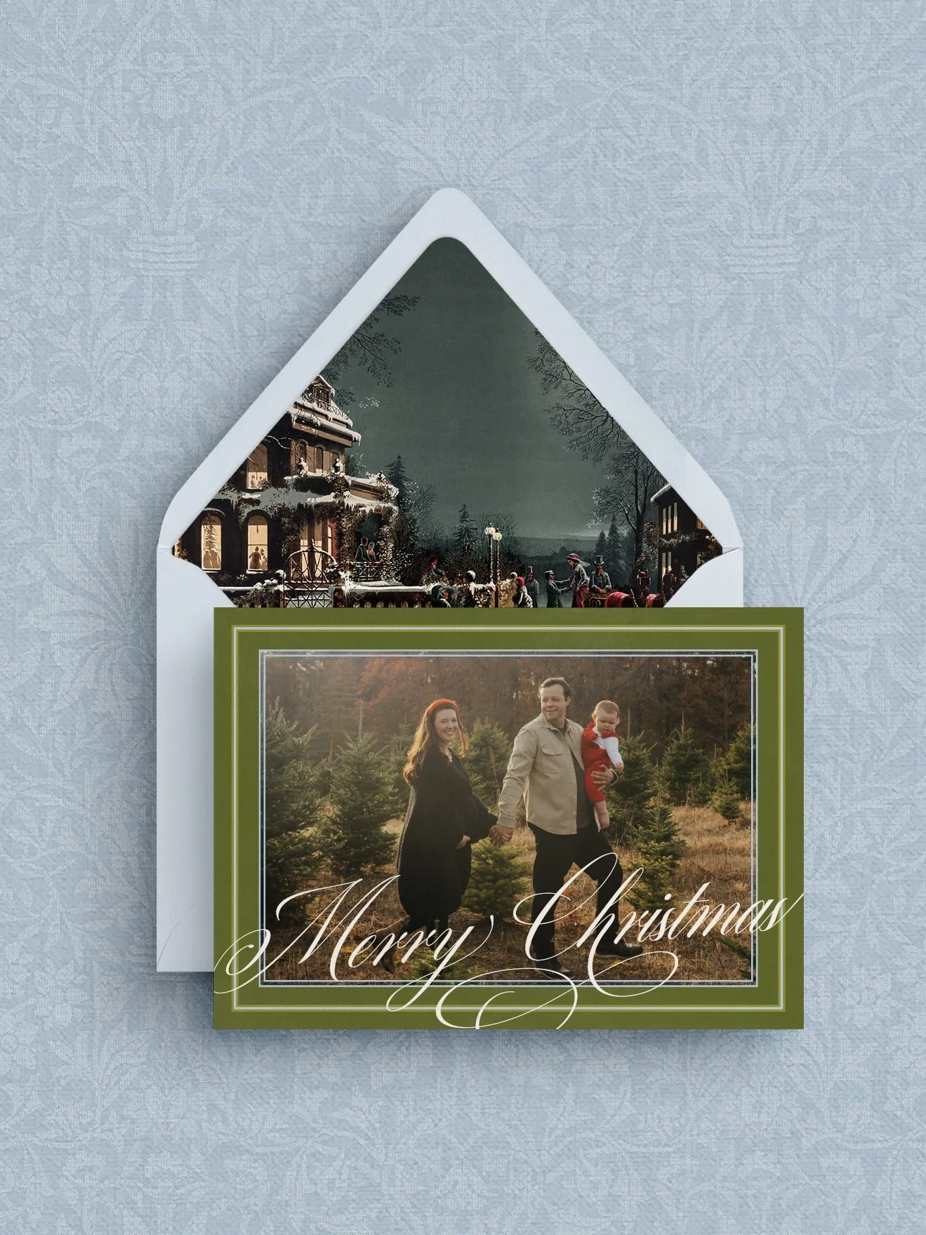 Option to enhance your Holiday Card with hand-lined envelopes featuring a vintage holiday scene