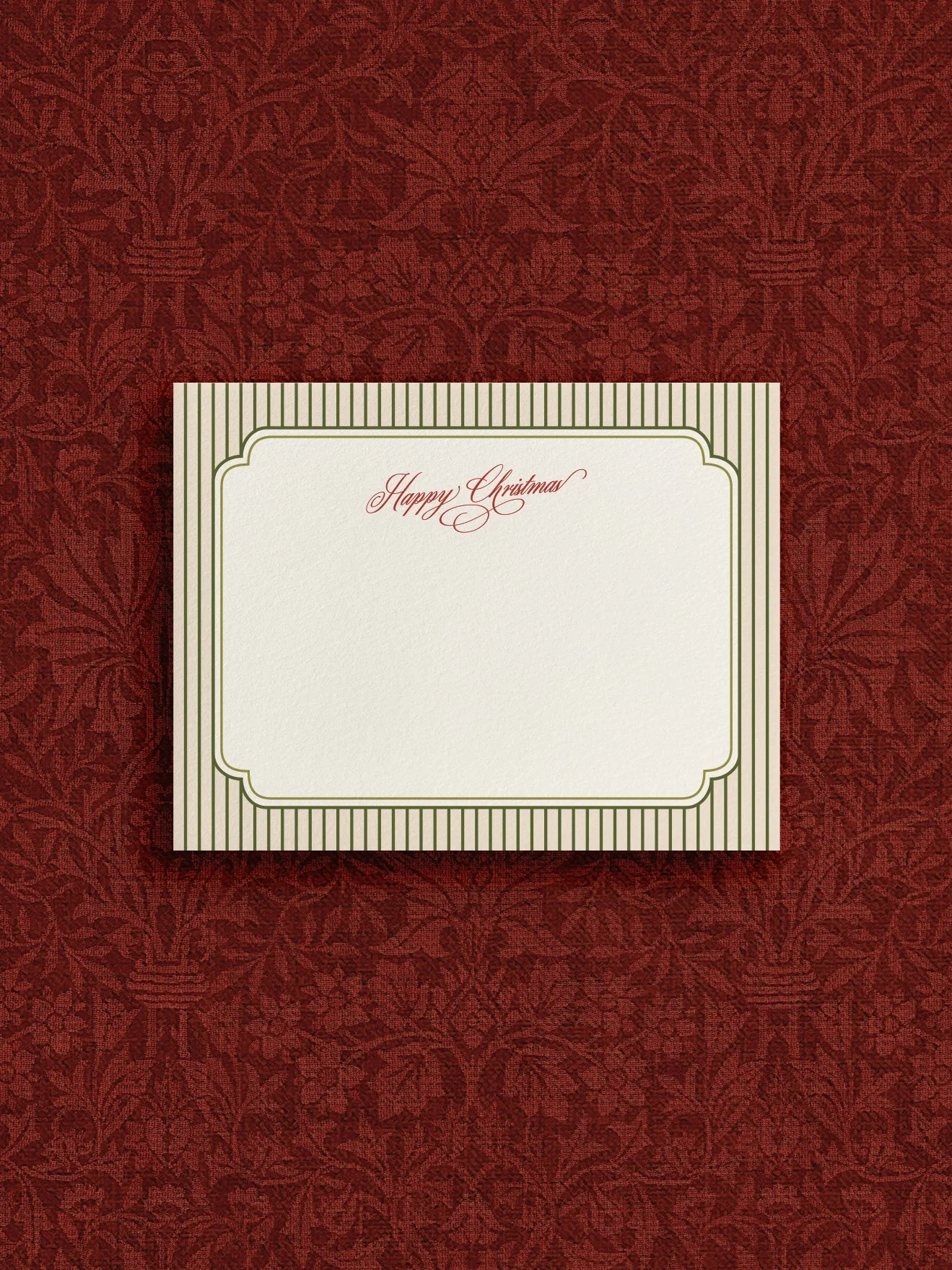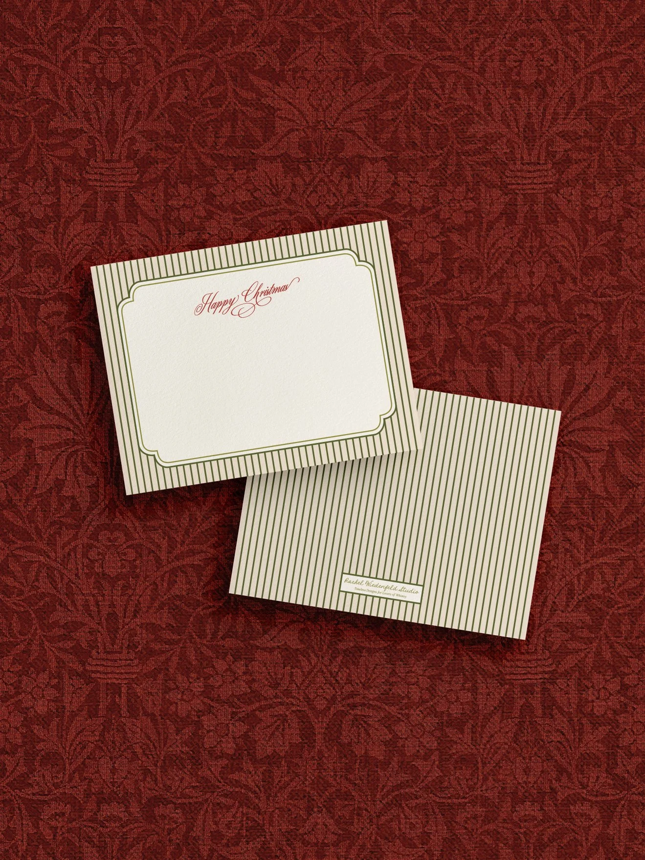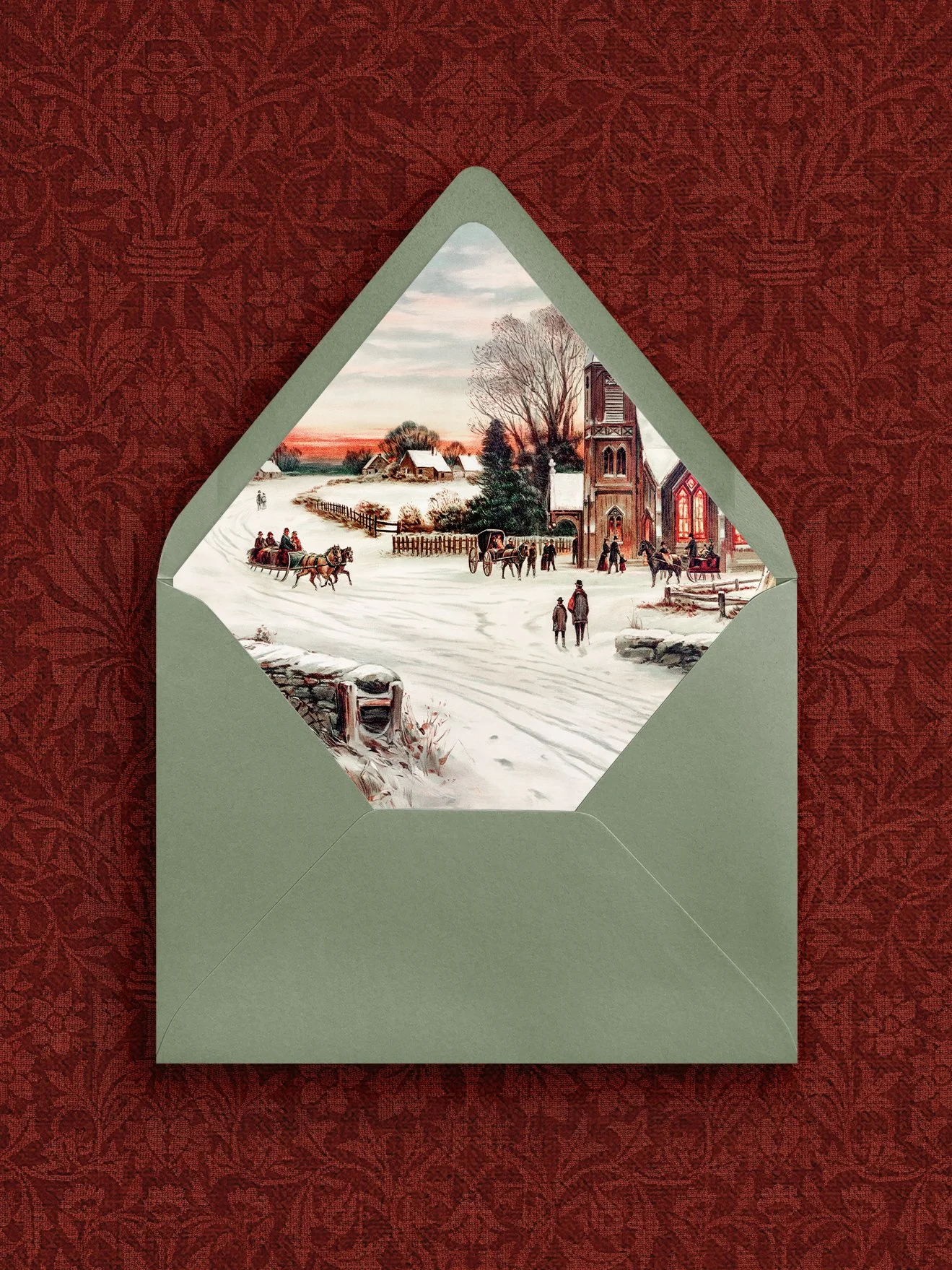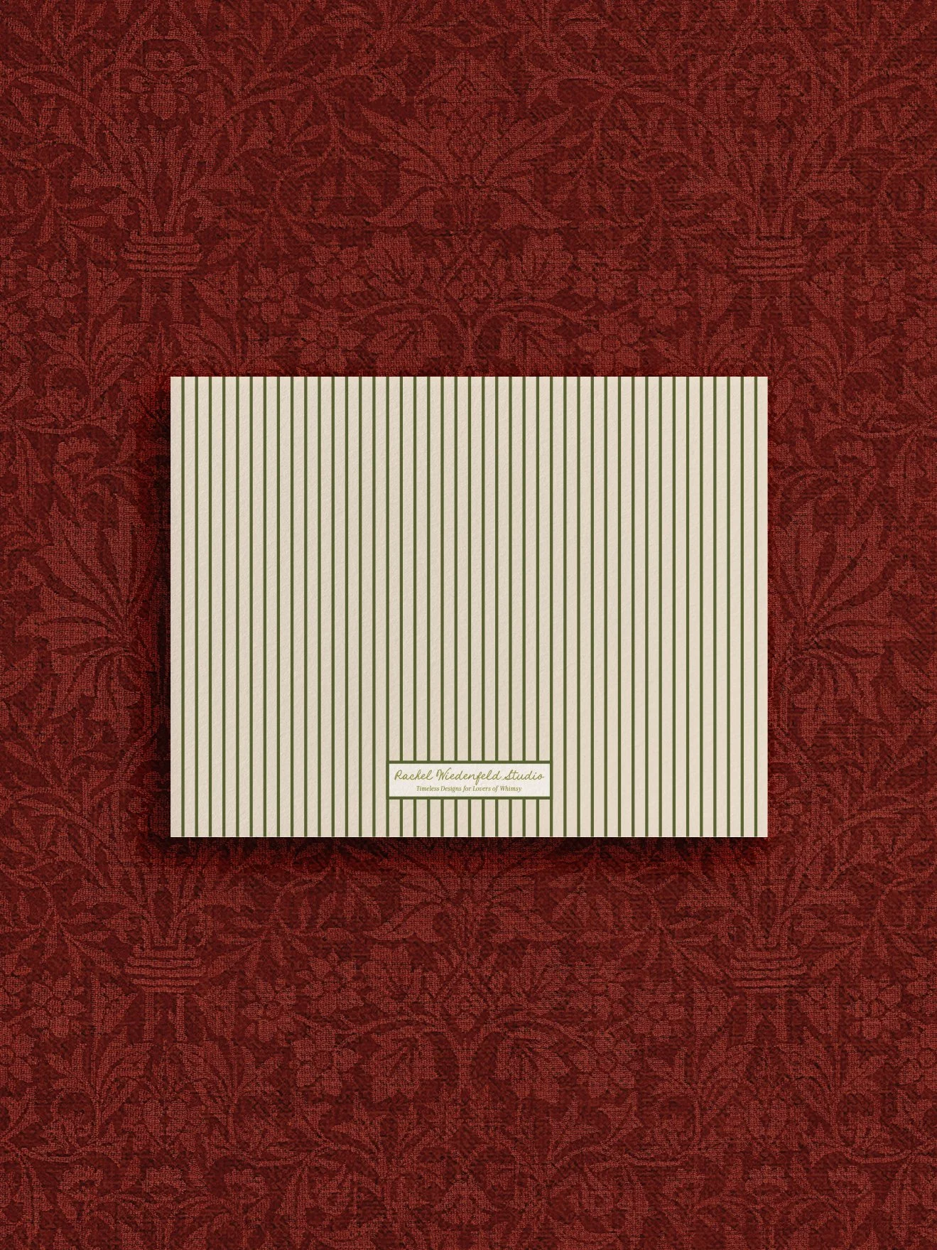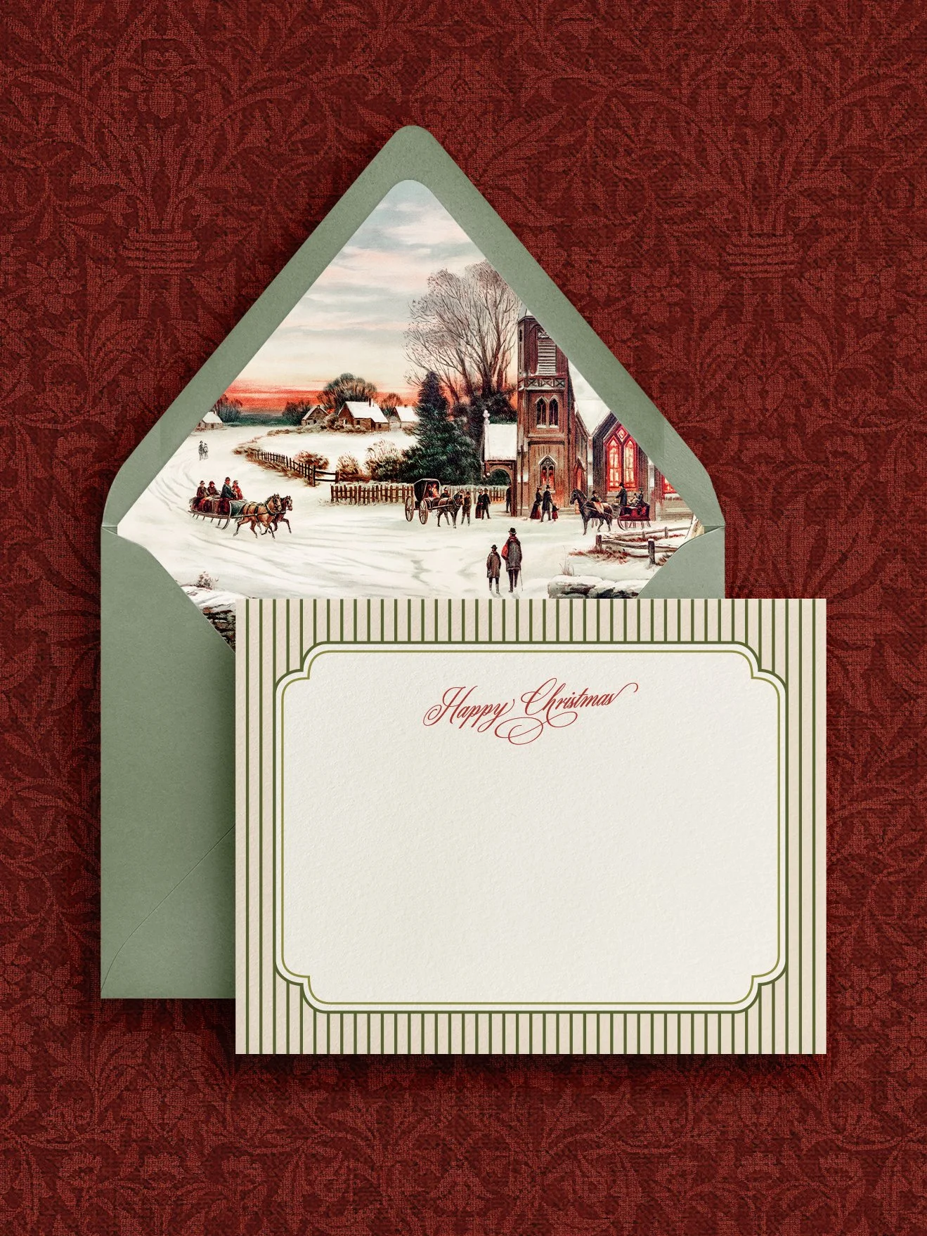 Bring the elegance of the past into the present with our Evergreen Ticking Stripe Stationery! Inspired by vintage textiles and the nostalgia of holidays past, these cards feature delicate ticking stripes reimagined in festive, winter hues, along with hand-lined envelopes featuring a cozy, vintage winter scene.